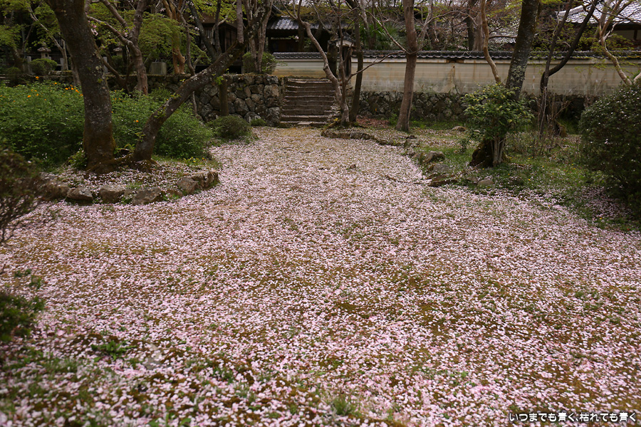本当は3月27日に訪れるつもりだったのに、忘れて飛ばしてしまったお寺です。一週間経つと情景は一変。枝に花はまだ残っているものの葉が出てきていますし、地面はピンクの花びらで覆われています。満開の情景も見たかったですが、この情景も美しいですしこれも縁なので、満開の情景は来年以降の楽しみしておきます。初めて訪れた勝持寺というお寺は花の寺とも呼ばれ、中に入ると高低差もあって広くてゆっくりとお寺の雰囲気を楽しめるお寺で、とても良かったです。