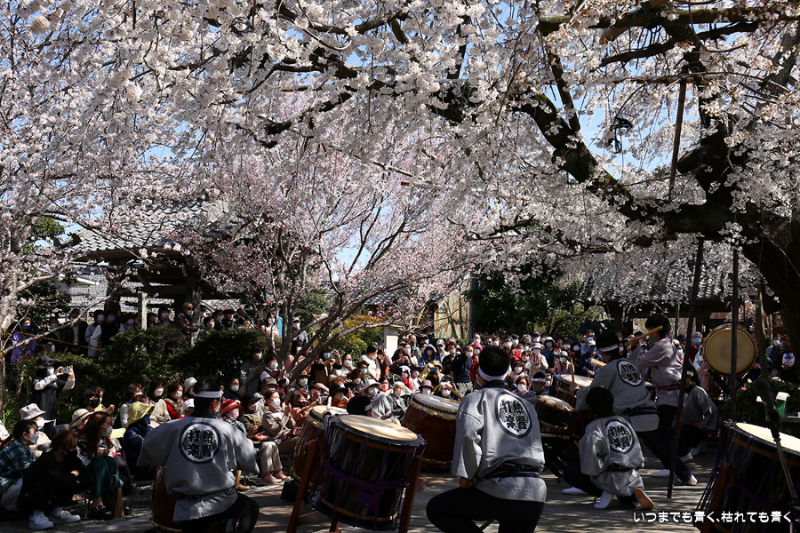 しだれ桜が見ごろの土日に行くのですから当然かもしれませんが、源空院を訪れるとよくイベントに遭遇します。今回は、源空院に着くとちょうど、西尾市を拠点とするプロ和太鼓集団「熱響打楽」の演奏中でした。桜の写真を撮るには不都合ですが、桜と演者という構図も面白いかもと思って撮影を楽しみました。最初は青かった空も二時間もすると白い空に変化し、雰囲気ががらっと変わったのも残念でしたが、それもまた面白いと思って楽しみました。最後の一枚は、写真撮影に行った場所でたまに遭遇する愛知県大村知事です。