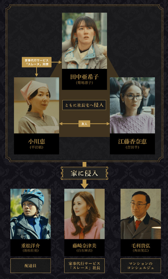 家事代行サービス会社で働く女性たちが、脱税によるタンス預金を目当てに社長宅に侵入するというお話で、その中で空き巣の重松やコンシェルジュの毛利などが絡んで二転三転のドタバタが繰り広げられます。3人の女性たちの会話やボケが面白く、自分たちの行動を棚に上げて毛利を警察に突き出すべきと主張するあたりは最高でした。被害者である社長を良い人だといったん持ち上げてから実は・・・と落とす展開も愉快でした。