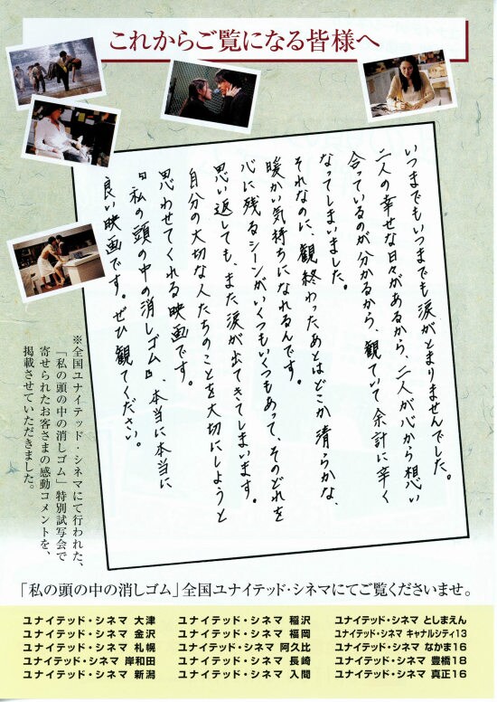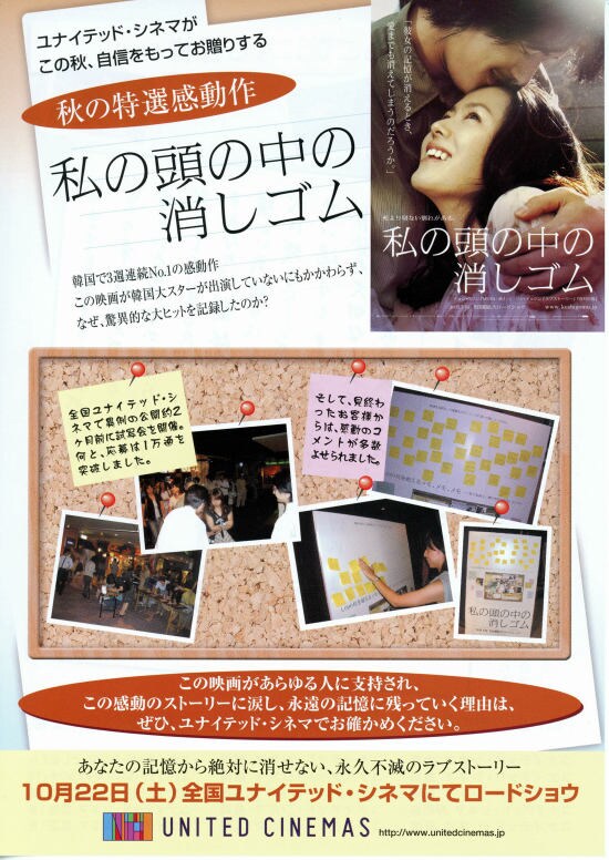 Soul〜君が僕を忘れても〜」。映画よりも先に、GYAOのオリジナルドラマ「私の頭の中の消しゴム アナザーレター」(30分/1話、6話完結)を見てしまっています。最終回を見逃しているため、私の中では完結した見方ではないのですが、毎回かなり泣かせてくれました。現在の恋人・周一(袴田吉彦)と過去の恋人・圭介(田中圭)との間を、記憶が行ったり来たりする中で賢明に周一を愛そうとする主人公・紗季(香稚由宇)。辛い思いの中でそれぞれが紗季のことを思い、切ない行動を選んでいく。それぞれの登場人物が優しく暖かく、それが余計にそれぞれの残酷な運命を悲しくさせます。そういう展開を期待していたせいか、韓国映画「私の頭の中の消しゴム」はかなり物足りなく感じてしまいました。最初に見ればそれなりに感動したとは思いますが、いくつかの点で気になるところが残ってしまいました。私が一番心にぐっときたのは、チョルスが家を出た時に残しておいた手紙をスジンが読む場面。チョルスの声でチョルスが手紙を書いたときの心情で読まれるのですが、スジンを忘れたくないという必死の気持ちが矢のように出てくる文章はとても心打つものでした。この映画で私たちが考えさせられるものは、人間の肉体と精神の死というものです。見守る側はどちらが辛いものなんでしょう。その現実にまだ直面したことのない私は、正直よくわかりません。精神が死んでも肉体が生きていてくれるだけでいいと思えて、その精神が死んだ肉体を愛せるのか、難しいことです。どんな状況になろうとも、人が人を愛し続け、相手を思いやる行動を選ぶスジンやチョルスのような生き方、私はできるのでしょうか。 |
