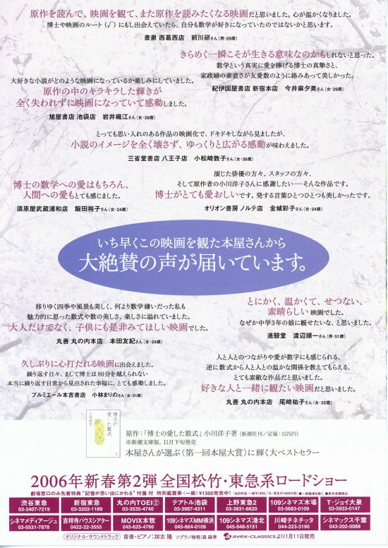 2006年1月21日(土)公開 / 上映時間:117分 / 製作:2005年(日本) / 配給:アスミック・エース=「博士の愛した数式」製作委員会