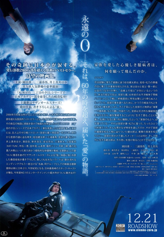 | 年末の大掃除や片づけが一段落した今日、家族で「永遠の0」を観てきました。人気映画ではありますが、さすがに大晦日の夕方の上映では、お客さんもガラガラでゆっくりと静かな雰囲気で楽しむことができました。「永遠の0」は小説を読んでストーリはわかっているにもかかわらず、涙無くしては観ることができませんでした。最初の松乃の葬儀での賢一郎が悲しみに崩れ落ちるシーンからもう泣いてしまいました。祖父の話をしてくれる戦友の話にもひとつひとつ感動があり、それぞれでジーンときます。宮部久蔵自身は戻ってきませんでしたが、いろんな人の心の中に宮部久蔵を残してきた、そういう生き方をしたいと思いますが、もう私の年では遅いですね。こういう映画には感動しても、戦争をきちんと理解できているかというと、私を含めて今の日本人はきちんと理解ができていないと思います。時代が悪かったとか、大本営が悪かったとか、教育やマスコミが悪かったとかいいますが、すべての普通の人たちが、人や命を大切にし愛する心を宮部久蔵のようにもっと強く語ることができれば、あの戦争はもっと違ったものになったかも知れません。また、それが出来なかったという普通の人間の弱さもきちんと理解しないといけません。余談ですが、身体に障害を受けた復員兵(傷痍軍人)は定職につくのが難しく、私が子どもの頃にも神社などで物乞いをするそういう人たちの姿があったことを覚えています。万歳で送り出した人たちなのに、傷ついた人たちへの偏見や差別。世の中の目は刻々変わる危ういものであり、どこを中心に考えるかで評価も変わるということを自覚し、自分の考え方の物差しはできるかぎり不変のものであろうと思いますが、なかなか難しいのが現状です。 |