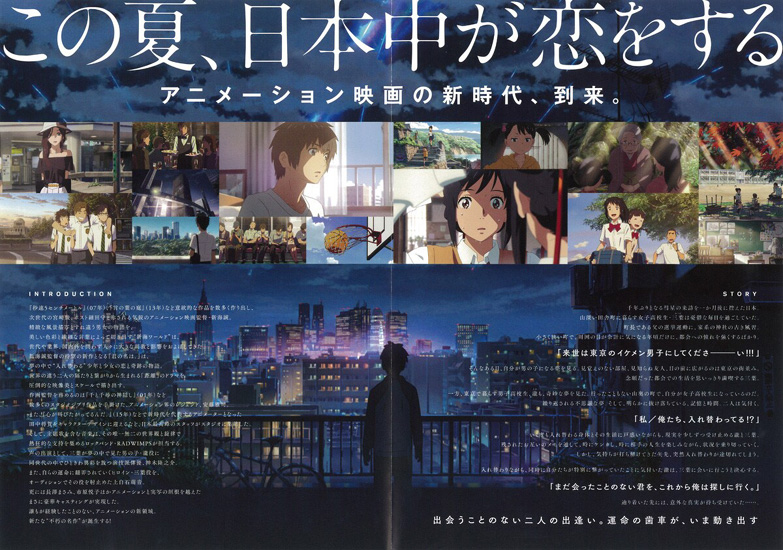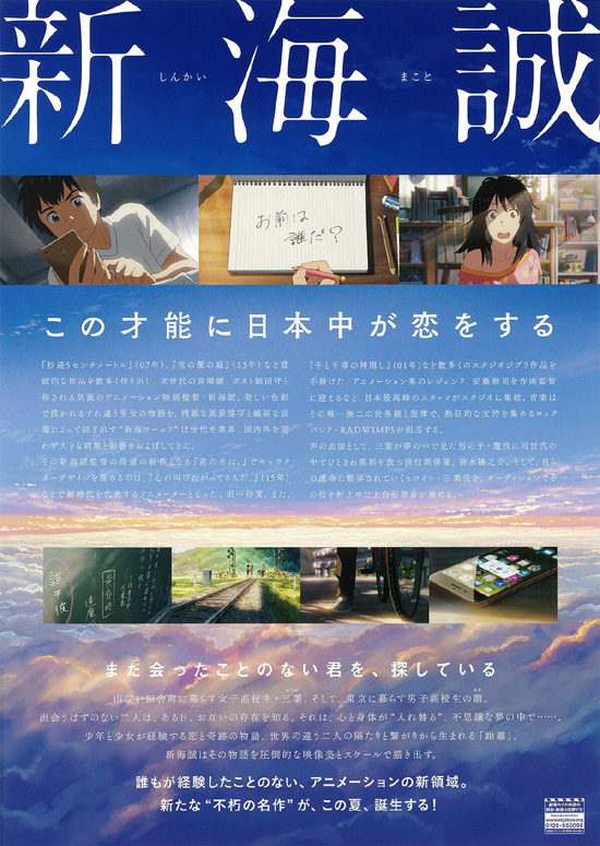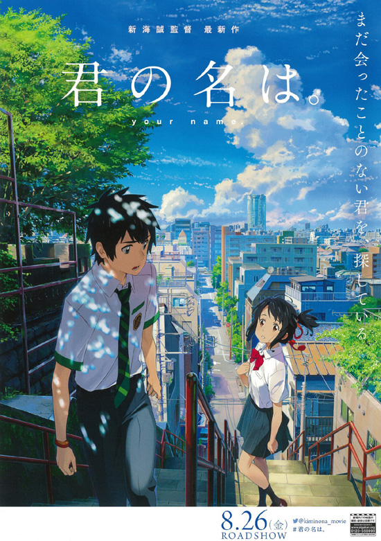 レイトショーで、ただいま大ヒット中の映画、「君の名は。」を観てきました。話題になっているのでとりあえず観ておこうかなという感じで観に行ったのですが、そんな気持ちを吹き飛ばすほど面白くて感動する映画でした。事前知識は何もなかったので、単なる恋愛アニメかと思っていましたが、とんでもない。最初の展開はよくあるパターンなので、このあとどう興味を繋げていくのかなと思っていたら、突然ミステリー風の壮大で奥深い展開となり、ひとつひとつのシーンや台詞に大切な意味があって、最後までストーリの中に引き込まれてしまい楽しませてくれました。映像も、田舎の風景、都会の風景ともとても緻密で美しく描かれていて、アニメであることを忘れてしまうほどでした。体が震えるような感じになる悲劇と迫力のシーン、相手を思う心の切なさと恋心とそれが通じ合う感動のシーン、そしてわざとらしさを感じさせない笑いのシーン、もうバランス感覚最高の素晴らしい作品でした。(入れ替わりすぐに初めての人間関係で生活ができるのかという突っ込みどころもありましたけどね。(^_^;))