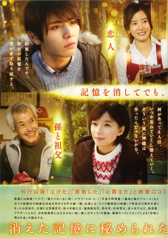 | 今日は「記憶屋 あなたを忘れない」を鑑賞。生きていくのに辛すぎる記憶を消してくれる記憶屋がいたなら、私も子どもたちが受けたいじめの記憶を消してあげたいと、そういう思いで感情が入ってしまい、最後の高原弁護士の手紙のあたりでは涙が止まらなかったです。テーマとしてはとてもいい映画だと思います。映画の作りとしては、七海の記憶を消したことと、ラストシーンの遼一と真希の会話は、ちょっとチグハグ感を受けてしまいました。ちなみに、この映画の主題歌は中島みゆきの「時代」です。 |