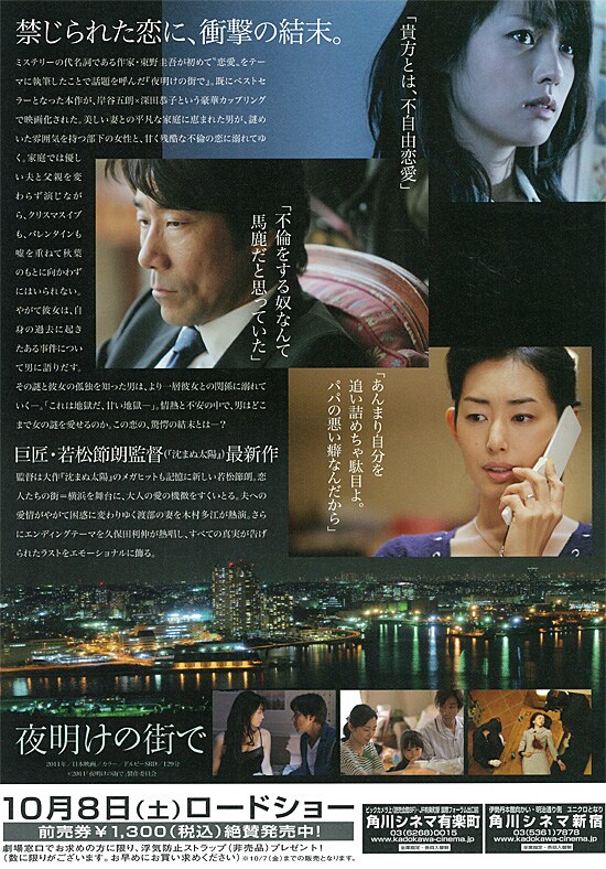 | 今日は日が変わろうとする時間から「夜明けの街で」を観ました。深田恭子が好きなのと東野圭吾の作品ということで観ましたが、これは私的にはハズレでした。小説では秋葉が15年前の殺人犯と疑われているということで推理小説というジャンルとして違和感ないと思うのですが(私は読んでいないですが)、映画は15年前の事件については秋葉が思わせぶりに話すだけで推理ドラマ的なところは無く、完全におバカな不倫映画でした。浮気は否定しませんがのめり込んで利用された渡部は一番アホだし(相手が深田恭子じゃそうなるかとも思いますが)、秋葉も父と叔母への報復(これが報復になったのかよくわかりません)と渡部への愛とどちらに軸足置いているのか分からないし、目的果たした後に最終的に泣きながら身を引くのであればそれまでの行動が結果的に身勝手。一番現実感あるのが渡部の妻である有美子で、腸が煮えくり返る怒りを抑えながら渡部に普通の態度で接することで渡部を支配する顛末は恐ろしくもありますが、それが妻の立場の強さであり打算だと感じました。ラブストーリーと言うにはあまりにも稚拙で、美しく可愛らしい深田恭子を見るためだけの作品でした。 |