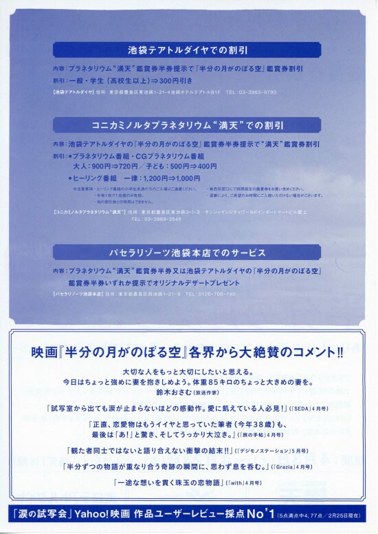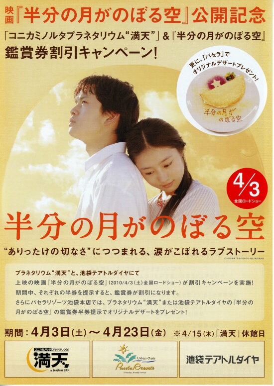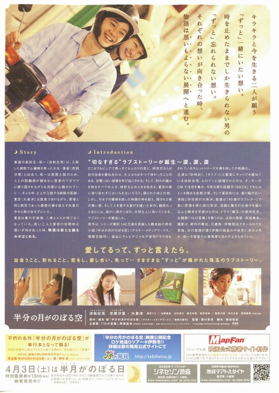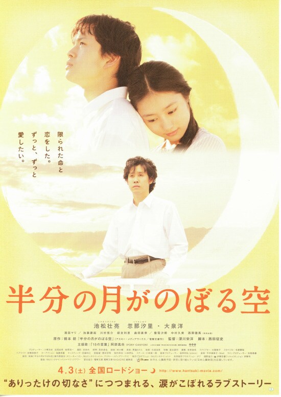 | 今日の2本目の映画は、「半分の月がのぼる空」です。大泉洋が出でいるということで選んだ作品で、事前情報無しで観ました。最初はヤンチャな若者のドタバタ映画かと思って失敗したかなぁと思いながら観ていましたが、裕一が里香と会ったあたりからだんだんと引き込まれていきました。里香が手術をして欲しい医者が大泉洋かと思っていたら、見事なトリックで良い意味で驚かせてくれました。そのトリックがわからない段階で、突然里香が里香でなくなったシーンでは理解不能で、なんども見直してしまいました。裕一が里香の母に里香に手術を受けさせるように頼むあたりから涙の連続でしたが、そのトリックがわかってからは、より悲しさや切なさがあふれて涙が止まりませんでした。雨の中、里香が倒れていた(と思われる)シーンも切なかったです。若い池松壮亮と忽那汐里、そして今とかわらぬ大泉洋がとても良い味を出していました。大泉洋の方言が関西弁としてはおかしいという口コミもありましたが、伊勢が舞台なので、三重出身の私からしたら大泉洋の伊勢弁はけっこうリアルでした。とても良い映画でした。 |