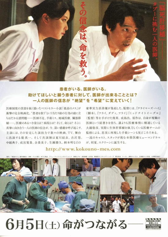 | 横浜に無事に行ってきてほっとしている今日は、借りていた「孤高のメス」を観ました。もともと医療ドラマが好きな私ですが、この作品も泣けるシーンが多くてとても良かったです。堤真一も好きですし、夏川結衣も好きなので、より感情移入できたのかもしれません。欲をいえば、大学を患者第一に立て直す出来事もあればより良かったと思いますが、2時間という中では、肝臓移植という出来事がメインになっているのは仕方がないのかもしれません。また、物語は亡くなった中村看護師の日記を医者になった息子が読むという形で進みますので、看護師視点になっています。中村看護師が当麻先生と別れるシーン、息子が当麻先生が院長であろう病院で働くことになったシーンが、ラストを飾るいいシーンでしっかりと泣いてしまいました。感動と笑いもあるいい映画でした。ただ、16歳の少年の肝臓を、年取った人間に移植することに対しては最後まで気になりましたし、故人の意思を尊重するのならば他の臓器ももっと役立ててあげられればという思いも持ちました。違法ギリギリなので、同じ病院内でやれる範囲で行うしかなかったのかもしれませんが、もっと先ある若い人への広い移植としてほしかったなぁと思いました。 |