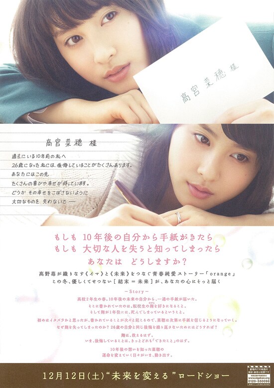 | 今年観た映画60作目は「orange-オレンジ-」。コミックの実写化ですが、この映画はとてもとても良かったです。泣いてしまうシーン満載で感動的な映画でした。未来からの手紙という要素が気になって選んで観たのですが、単なる学園モノとSFっぽい話を絡めただけかもと思っていましたが、初々しい菜穂と翔の恋心、翔の悩みを察することができず命を救えなかったと後悔する菜穂、お互いのことを信じて助け合う6人の友達、母を死に追いつめたと後悔する息子、が巧みに絡み合っていてとてもいいストーリーでした。演じる俳優も、菜穂役の土屋太鳳は可愛さだけでなく芯のあるしっかりさが出していたし、須和役の竜星涼はとても優しくいい男だったし、翔役の山崎賢人は悩みを持つ繊細な感じがよく出ていたし、その他の3人の友人もとてもいい奴でした。何度も観てみたくなる映画でした。なお、タイトルの「orange-オレンジ-」は、ラストシーンのパラレルワールドでそれぞれが見ている美しい夕日の色を表しているとのことです。 |