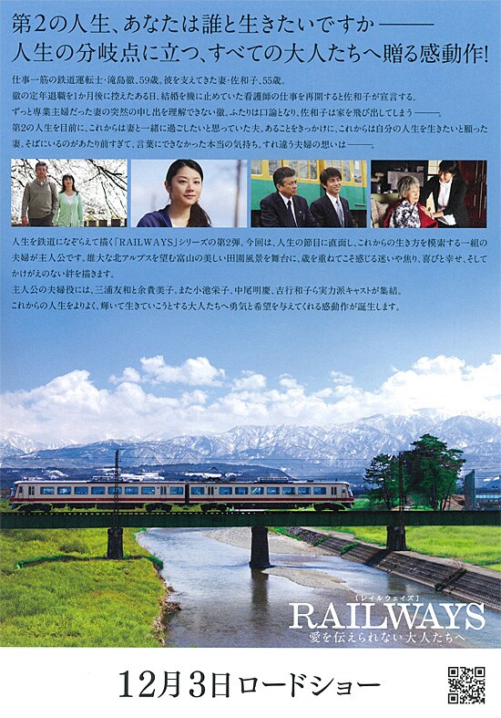 | 順番は公開順ではありませんでしたが、これで「RAILWAYS」3作をすべて観終わりました。結果的には、この2作目が私には一番良かったです。男は妻を自分の人生の一部であり持ち物のように思ってしまいますが、そうではないことをこの10年以上前の映画であらためて教えてくれます。自分の思い通りでなければ「出て行け」とすぐに言ってしまう男連中。徹がしみじみ言っていた「ひとつのことをやりとげるのに精いっぱいだった。しかし、それだけじゃダメなんだ。それを今思い知らされた」という言葉。男は「自分が敵の多い世界で戦っている、だから自分を助けるのが当たり前」みたいなプライドや驕りがあるのでしょうね。夫の人生も妻の人生も子どもの人生も、すべて本人のもの。家族が助け合うのは当たり前ですが、それぞれの人生を尊重するのも当たり前。そんなことをこの映画であらためて考えさせられました。徹がすべてを理解して、離婚届を出して結婚指輪を捨てるシーンがありましたが、これも妻の心情をしらない自分勝手な行動と一瞬思いましたが、いやいやこれは新しい人生を二人で歩むあらたな出発点なのだろうな、あらためて結婚を申し込むのだろうなと読み解くことができましたが、それは物語としては美しく感動的なのですが、そこは私の年齢になっていろいろと知ると年金や相続のなどのことを考えると大丈夫かなという現実的な心配をしてしまいました。相手の話をよく聞く、相手の立場になって考える、それが大事ですね。涙が止まらないという映画ではありませんが、最初から最後までいろいろと考えさせてくれるとても良い映画でした。 |