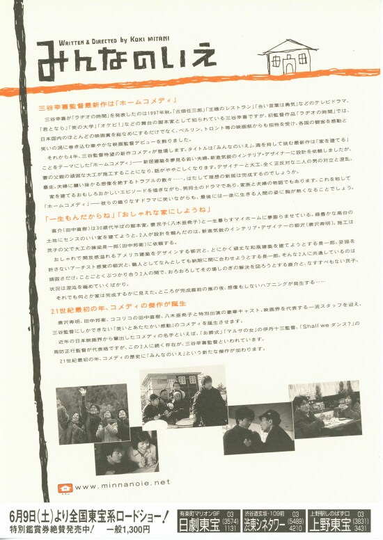 | 三谷幸喜脚本・監督ということで観てみました。20年以上前とは言え、有名な俳優さんを贅沢に使っています。本人役の中井貴一や松重豊などです。またエンドクレジットにも出てこない明石家さんま、香取慎吾、真田広之らも出演しています。映画は、昔気質の大工の田中邦衛と、形にとらわれないデザイナーの唐沢寿明がぶつかり合う中で、頼りないシナリオデザイナーの田中直樹がその間を取り持ったり嫉妬したりして、最後は田中邦衛と唐沢寿明が認め合うというストーリーです。三谷幸喜っぽいふざけた感じは随所にあって、そういうのは私は好きなので最後まで興味は持って観ましたが、大笑いするような面白さは無く、家づくりも何か非現実的なところがあって、私的には中途半端かなぁと感じる映画でした。 |