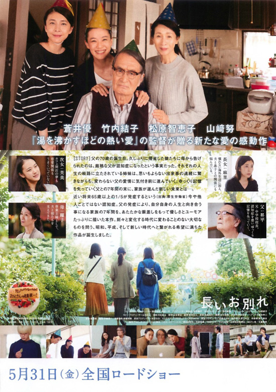 | 認知症がテーマであるということと、蒼井優と竹内結子が出演しているということで選んだ映画です。認知症になれば自分の意思でどれだけコントロールできるのかわかりませんが、記憶は消えて行ってもまわりに暴言や暴力など与えずに、昇平のように、周りが遠く感じていくという悩みの中でも静かに消えていくことができればと思いますね。そのためにも、今から自分の本性を穏やかな人間にしておかないといけませんね。また、逆に連れ合いが認知症になった場合、曜子のように愛情を保てるかというのも大きな課題ではあります。この映画では、この家族を見ていてそんなことを強く感じさせてくれました。最後まで原因や詳細が私にはよく分からなかったアメリカで暮らす麻里の息子の崇の不登校の問題についても、アメリカの先生が「不登校の原因はほとんど親に原因がある」という言葉も、完全に同意はできないものの、そういう面もあったかなと自分に置き換えて考えてしまいました。そういうことを思いながら冷静に観ていましたが、後半、遊園地で家族が過去の記憶を思い出した時、麻里が自宅前で夫と泣きながら話をする時、人工呼吸器をつけるかどうか決断する時、などは涙があふれてきました。妻役の松原智恵子、夫と息子の関係に悩む長女役の竹内結子、恋愛や仕事に悩む次女役の蒼井優は、苦しい中でも家族愛があふれて思わず笑ってしまうような明るい家族をとてもよく表現していました。タイトルの意味は、最後に崇の面談で明かされますが、なるほど、そういうことなのねと考えさせられます。完全な記憶のまま一瞬で別れるのがいいのか、大変でも長くかけて徐々に記憶を無くしながら別れるのがいいのか、どちらが本人と家族にとって幸せなのかは一概に言えませんが、どちらでも受け入れる余裕を持っておくことが大事なのでしょうね。芙美が行き詰って父に弱音を漏らした時の、認知症が進んだ父の言葉、「そう、くりまるなよ」。意味不明ですが、落ち込んだ時になんかしっくりきそうな気がしますので、頭に入れておこうと思います。とても良い映画でした。 |