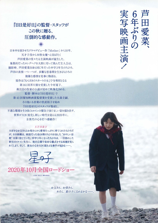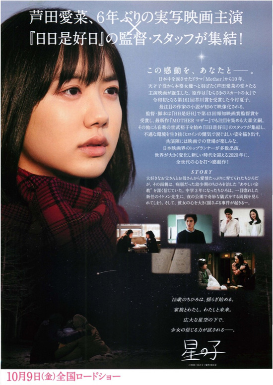 | 芦田愛菜の6年ぶりの実写映画主演作ということで観てみました。こんな内容だったのかと、ちょっと気が重くなりながら観てしまいました。私は生きている人間が教祖である宗教に対しては強い拒否アレルギーがあり、そういう話が出てくるだけで、いくら社会性があるストーリーでも拒否反応を感じてしまいます。新興宗教に傾倒する人を演じる俳優に対しても、よくこんな役を引き受けたなぁと思ってしまい、話が素直に頭に入ってきません。そういう見方しかできない中で思ったことは、芦田愛菜の演技のうまさでした。ちひろは、幼い頃自分を救ってくれた「金星のめぐみ」をきっかけに宗教にのめり込んだ優しい両親を、普通じゃないと思いながらも嫌いにはなれなくて(むしろ大好き)、複雑な思いや揺れ動く心の動きを持っている人物です。そういう難しいちひろを、芦田愛菜はとてもよく表現していたと思います。親子三人で星を眺め一緒に流れ星を待つラストシーンを見ると、ちひろは両親と一緒に信仰していくことを選ぶのだろうなぁという終わり方でしたが、それでちひろは幸せになれるのか、複雑で切ない感情で観終わりました。残念ながら、私はこの映画で感動は感じることはできませんでした。 |