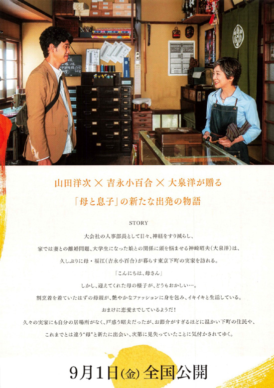 | 私は山田洋次の映画はあまり好んで観ないのですが、この映画は大泉洋が出ているので、どんな感じかなと興味があったので観てきました。舞台挨拶でも山田洋次監督の発言に首をかしげるところがあって、自分とは価値観が合わないのかなと思っているのですが、この映画も私にはなにかしっくりきませんでした。苦悩するサラリーマンの描き方も薄っぺらいし、木部もさすがに大会社であんな行動はしないだろうと思ってしまいます。直文の鈍感さもとても気になりました。ギクシャクしていた昭夫と舞の関係も、昭夫が仕事で悩んでいるということだけで、あっさりと仲良くなっているのもありえないと感じてしまいます。つまり、登場人物の本質がみんな似通っていて良い人過ぎて仲良くすぎて現実感がないのです。実際はもっとドロドロしているし、悩みも深いと思うのです。昭夫は好きな人ができたかもしれない妻を許せたのか、自分らしくないといいながら会社を辞めるまでの苦悩はなかったのか、そういう部分が軽すぎるのです。そんなことを感じながらの鑑賞でしたので、この映画で感動も心に響くこともありませんでした。東京の下町の人情は、確かに人間的で暖かいのかもしれませんが、悩みも恋も、もっと奥深くまで描いてくれないと、その良さは伝わってこないと思いました。いくら好きな大泉洋とは言え、笑いも共感も感動もなく、淡々とストーリーを追うだけの映画はちょっと私にはつらかったです。 |