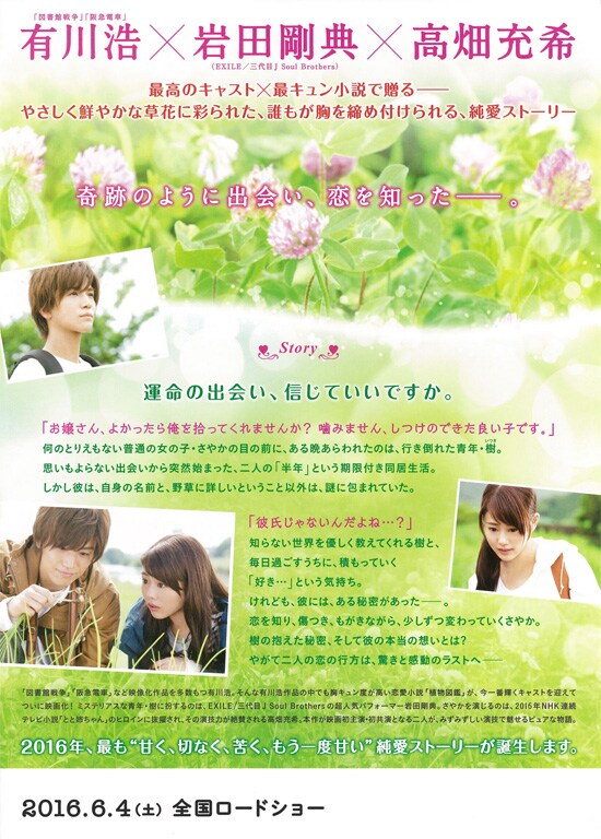 | 高畑充希が好きなのと、予告で興味を持ったので観ました。高畑充希がさやかの感情をとてもうまく可愛らしく表現していて、それを見ているだけでも価値ある映画でした。あまりに可愛くてさやかと高畑充希を同化した目で見てしまいます。ストーリーは、途中でさやかが可愛そうに感じてしまいどうなるのかなと心配になる部分もありましたが、最初の半年のふたりの仲睦まじい関係と、最後が最高のハッピーエンドなので、とても気持ちの良い心温まる内容でした。特に、樹が事情をさやかに川辺でスピーチを再現して説明するシーンは、感動して泣いてしまいました。ただ、さやかの気持を思うと、映画だからの盛り上げるストーリーだから仕方がありませんが、樹がさやかのアパートを去る時はもう少しさやかのことを思っての対応をしてほしかったなぁと、高畑充希の肩を持つような見方をしてしまいました。普通ならば理由も行先もわからずに1年も放置されたら心折れてしまいます。いつまでもこういう映画で泣ける自分でいたいなぁとあらためて思った映画でした。 |