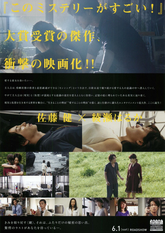 | 主役級の俳優を少しだけ使ったり贅沢なキャストです。映画はなかなか難しくてすべて理解が追い付かない映画でした。何がリアルで何がバーチャルなのかわからない感じで描かれるので、最初から浩市のリアルが実はリアルではないのだろうということを推測しながら観ていました。そこに首長竜の絵の話が唐突に出てきており、首長竜が何を意味し表現しているのか最後までとてもわかりにくかったです。原作ではこの首長竜がもう少し必要性を持ったものに関連付けられているようですが、映画では浩市にとって淳美にとって首長竜がどういう意味を持っているのかが私にはわかりにくかったです。この映画はDVDレンタル店では「邦画ラブロマンス」にジャンル分けされていましたが、内容的にはラブロマンスという感じではなく、どっちかというとサスペンスがホラー(というほどではないですが)っぽい感じで、最後まで少し不気味な感じが付きまといました。浩市と淳美のふたりの関係も謎解きっぽいので、深い愛情や優しさもあまり感じるところがなかったので、あたたかい感じや感動もありませんでした。ここ数作、私の好みからいうと少し期待外れの映画が続いてしまいました。 |
