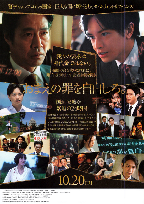 | 久しぶりに奥さんと長女と三人で観てきました。中島健人と堤真一も好きな俳優さんですし、ストーリーも面白そうなので期待大の映画でした。その期待通り、テンポが良くて内容的にも楽しめる映画でした。ストーリーも映像もスケールが大きくて真実味がありました。ただ、予告を見て、中島健人が政治家であり罪を犯した堤真一を「自白しろ」と追い詰める物語だと思い込んでいたのですが、そうではありませんでした。政治家の家族の物語であり、政治家の汚れた部分を考えさせられる物語でした。映画の中だけではなく、日本の政治家は政治理念よりも自分の利権や欲望が強いのかなと、あらためて思って情けなく感じてしまいました。それを家族はどう受け入れているのかも気になります。映画は、誘拐された孫娘を助けるために、自分の罪を告白するかどうかという会見へのタイムリミットに向けて、「国か家族か」を迷い判断していく緊迫した内容ということでしたが、その部分はあっというまに時間が過ぎてしまい、あまり緊迫感を感じませんでした。会見内容をどうするかという葛藤や裏工作みたいなものがもう少し表現されていればよかったかなと感じました。中島健人演じる晄司は、最初は純粋な正義感だけの男に見えましたが、木美塚とのやりとりあたりからしたたかさを見せ、ラストの国会議員のシーンでは、この先政治を変えていく政治家になるのか、父親と同じように清濁合わせ飲むのか、そこは観ているものの感じ方に任されたようで、私はすっきりした終わり方ではないなぁと思いました。また気になったところとして、誘拐事件が起きるシーンでは、私も思っていて奥さんと長女もあとで言っていましたが、狭い道で子供を自転車に乗せていて後ろから自動車が来たら、そのまま乗っていることは無くて、少なくとも自転車を降りて子供の安全を確保するよねというのが我が家の意見でした。そこはこの物語の始まりなので、もう少し考えてリアルさが出ていればよかったと思いました。 |