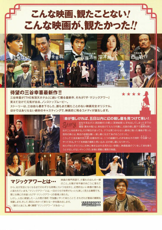 | また体調を崩しているので、横になって気楽に観ることのできる映画ということで、三谷幸喜の「ザ・マジックアワー」を観ました。備前がギャングのボスの愛人マリに手を付けたことがボスに見つかり、命を助けるかわりに伝説のスナイパーをボスに会わせるということから起きるドタバタです。その伝説のスナイパー役を売れない俳優、村田に映画撮影と称して依頼するのですが、佐藤浩市が演じる「売れないけれども熱い俳優魂を持つ俳優」である村田がとてもいいです。真面目に考えると、芝居でやっていることなどギャングたちは気づくだろうと思うのですが、うまく騙されていく純粋さと滑稽さも面白いです。三谷幸喜の映画らしく、ちょい役で有名な俳優さんが出ているのも見どころです。マジックアワーというのは、日没時の太陽が地平線に沈む一瞬の時間のことで、その時間は幻想的ないい映像が撮れると言われているらしいです。一日で世界がもっとも美しく見える瞬間だそうです。この映画を観ると、人生ももっとも美しく輝く素晴らしい瞬間があるのだなぁと思わせてくれます。その瞬間のために生きる、そういうことなのかも知れません。テンポよく引き込まれていく楽しい映画でした。 |