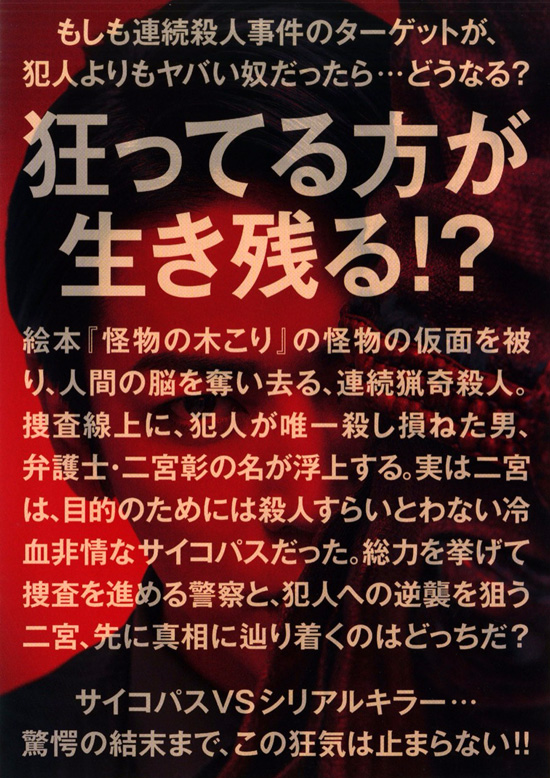 | 公開前から気になっていた「怪物の木こり」を長女とふたりで観てきました。期待以上、とても楽しめました。サイコパスが実は生まれながらのものではなかったということ、脳泥棒と呼ばれる連続殺人事件のそれにからむ悲しく切ない結末、最後までどうなるのか予測がつかない秀逸なストーリーでした。亀梨和也は二宮の役柄にぴったりで、何を考えているかわからなくて奥深くにある残酷さを見事に表現していて魅力的でした。連続殺人事件を追うプロファイラーの菜々緒も、二宮の恋人役の吉岡里帆も良かったです。本当は優しい普通の人間だったのに強制的にサイコパスに仕立てられ、あるきっかけでその呪縛(効果)から解けた時の自分のやったことへの絶望感、それがラスト前の二宮と意外な人物だった怪物の会話で切なく強烈に心に響いて伝わってきて、涙があふれてしまいました。本当の自分を取り戻し、サイコパスを殺し絶望で命を落とすことを選んだ怪物と、絶望の中でも婚約者を守って生きていくと決めた二宮、どちらもつらく悲しい選択です。しかし、本当のラストでさらに悲しい結末・・・、そこでサイコパスに戻ってしまったのかと思わせる二宮の行動は実は最後の映美に対する優しさと謝罪だったというのもまた悲しすぎました。私はこの泣ける結末に大満足でしたが、一緒に観た長女は二宮は最後はまたサイコパスに戻ったほうが面白かったかもと言っていました。ホラー好き、怖いもの好きな長女らしいです。それにしても、人間の感情というのは、何が"普通"なのでしょうね。そういうことも考えさせられる内容でした。本当に見ごたえのあるストーリーとキャストでとても面白い映画でした。なお、「怪物の木こり」のパンフレットは数日前から品切れ中になっていたのですが、映画を観終わって出てきたら入荷となっていて本当にグッドタイミングで入手できました。昨日観に来る予定を体調不良のために今日にして良かったです。入場者特典は、パンフレットと同じ写真のポスターでした。 |