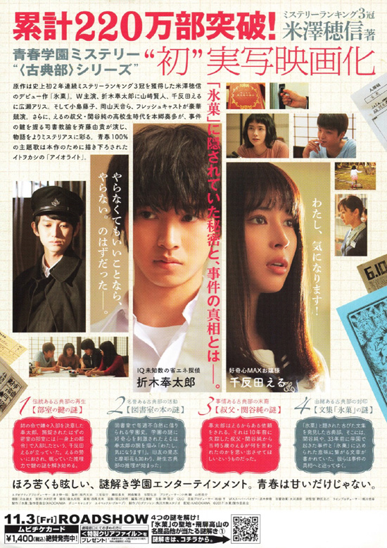 折木奉太郎:山崎賢人 / 千反田える:広瀬アリス / 伊原摩耶花:小島藤子