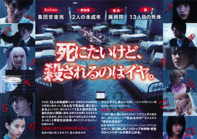 | この映画はずっと観たいと思っていた映画で、やっと観ることができました。私は何の前知識も無くて、死にたい人間が集まって一人ひとり死んでいく殺伐とした物語かなと思っていたのですが、まったく違いました。死にたい人間を集めて話をしあったり関係を深めたりしながら、最後には生きるということを選択するという物語でした。ただ、単に話し合うということではなく、12人だけではなくもう一人いるということから、それが誰なのか、誰が連れてきたのかということで、犯人捜しの推理が展開されていきます。12人の時系列的な動きを明確にしていくことで真実が見えてくるのですが、その解き明かしはけっこう面白かったです。エンドロールの時に時系列的に12人の行動が流れるのは、ああそうだったのかとおさらいになって良かったです。本当に死にたいと思っている子どもたちが、現実的には、このやりとりや出来事だけで前向きに生きる考えになるとは思えないところはありますが、いろいろ悩んで死にたいと思っている人には観てほしいと思いました。 |