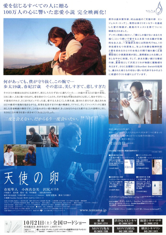 | 悪くはない映画でしたが、共感したり感動したりまではいかない映画でした。歩太の純粋さは認めることができるけれども、人の気持はあまり考えないところがあって少し自分勝手にも思えます。春妃と夏妃は仲の良い姉妹のはずなのに姉妹の雰囲気がちょっと乏しい感じがします。ストーリーもタイトルの天使の卵の意味が深く伝わってきませんでした。現在と4年前の出来事を並行して描く手法も、どちらかわかりにくく混乱するところもありました。春妃の死も唐突に感じました。感じの良い恋愛映画ということは確かで不快感もありませんが、ただそれだけという感じの映画でした。若い頃の市原隼人、池尻エリカは観ていて初々しく、小西真奈美は今と変わらない感じがしました。 |