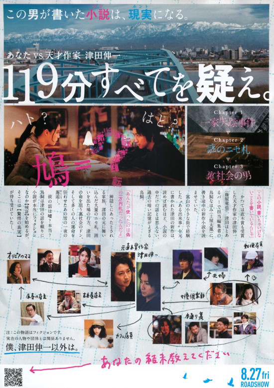 | それなりに面白いストーリーだとは思いましたが、どちらかといえば退屈な映画ではなかったという程度で、痛快さや笑いや感動など、観て良かったというようなものはあまり感じませんでした。津田の書く小説の内容と現実の描き方が最初はわかり難くて、その描き方を理解するとああそうかと観ることができますが、もう少しその前提をうまく導入してくれればと思いました。それと、現実を小説にしているという意味もわかり難くて、この映画で観る人に何を伝えて楽しんでもらおうとしているのか私にはしっくりきませんでした。細かなところでは、偽札の意味もよくわかりませんでした。偽札なんて今では得する犯罪でもないのに、倉田はどうして偽札を手に入れようとしたのでしょうか。「鳩の撃退法」というのは、その現実を小説にしたもののタイトルみたいですが、鳩=偽札と考えても意味不明ですし、よくわかりません。わからないわからないの多い映画でしたが、それでもテンポは良くて退屈はしなかったです。それと、やはり私は藤原竜也は好きにはなれません。どんな役でも同じようなキャラクターにしか見えなくて、この映画ではとても小説家には思えませんでした。 |