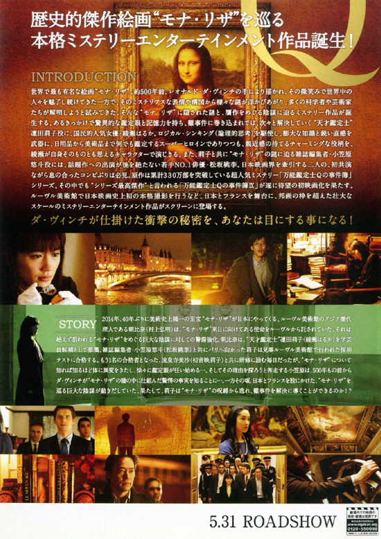 | 綾瀬はるかのミステリーものということで観てみましたが、ちょっと期待外れでした。前半は来日する絵画『モナ・リザ』の臨時学芸員のテストと研修に終始し、それがのちの重要な出来事になるにせよ、意味不明でした。研修で、2枚偽物だと思うものを選んでそのうちの一枚をもう一人が選んで排除するという方法も、最初はなぜそんな面倒なことをさせるのか、なぜそれが訓練になるのかが腑に落ちず、まったくストーリに入り込めません。あとでそのやり方が莉子の真贋力を狂わせることになるというわけですが、最初から観る側が疑問をもつために「やっぱり裏があったのね」という感じしかしませんでした。逆にそこで賢明な莉子がおかしいとなぜ感じなかったのかというほうが気になりました。また、莉子が一夜でフランス語を完全理解するというのも、独特の記憶法があるとの設定にしろ、とても非現実的な感じがします。それと、『モナ・リザ』という世界的な芸術作品を扱うには軽い感じがします。ミステリー的な要素や謎解き要素も弱くて魅力に乏しい映画でした。 |