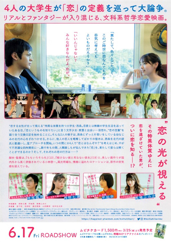 ストーリーは、恋する女性には光が見えるという大学生の西条、その西条を幼い頃から好きな北代、しかしその恋心に対して西条は光を感じない。そのふたりの関係の中に現れて西条が一目ぼれしてしまう東雲、その東雲は「恋を知りたい」といって西条と議論をしながら仲を深めます。そんな3人の中を見て略奪恋ばかりしている宿木がからんでいくという大学生4人の物語です。
