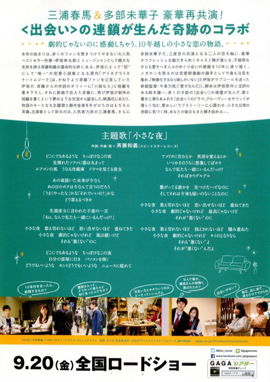 | 「アイネクライネナハトムジーク」は伊坂幸太郎の小説で、タイトルはモーツァルトの同名楽曲から採用されており、「アイネ(ある)クライネ(小さな)ナハト(夜の)ムジーク(曲)」という意味だそうです。伊坂幸太郎と斉藤和義の絆から生まれた作品だといわれています。いくつかの男女の出会いと愛情をほのぼのとした雰囲気で心地よく見せてくれます。物語は、街頭アンケートをしていた佐藤が、ボクシングの世界王座のタイトルマッチの大型ビジョンの見える場所で、ギターの弾き語りの前で紗季と出会うことから始まります。佐藤の親友である織田夫婦や、その織田夫婦の友人が世界チャンピオンの恋人だったりと、都合の良いつながりはありますが、その三つの男女が素敵な関係を見せてくれます。その10年後、佐藤と紗季は同棲はするものの惰性のような生活で結婚するきっかけがつかめないままいるのですが、再挑戦の世界王座のタイトルマッチの夜に昔の気持を取り戻して結婚に至ってハッピーエンドとなります。織田夫妻の娘と久留米の若い恋心や告白の決意、親に対する思いの変化なども微笑ましくサイドストーリーのように描かれています。この物語の中で、「出会うきっかけが運命ではなく、そこで出会ったのが君だったことが良かった」のかどうかを問うシーンがよく出てきます。それは偶然の機会が与えてくれたという受動的な関係ではなく、個人と個人が求めあったのだという能動的な考え方の大切さを教えてくれます。とてもいい映画でした。 |