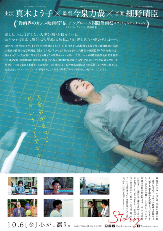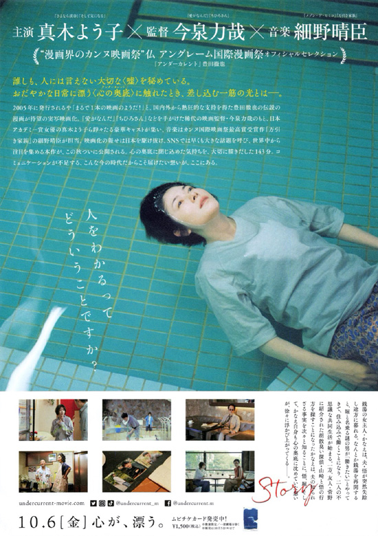かなえと悟は親から引き継いだ銭湯を営んでいましたが、ある日悟が失踪してしまいます。ショックと人手がないことから一時休業していた銭湯に堀と言うひとりの男が紹介されて現れて銭湯で働くことになります。かなえには、水の中で首を絞められるという夢を見るという心の影があります。かなえと悟と堀の心の深層(アンダーカレント)がだんだんと明かされることによってお互いを理解しあっていくというストーリーです。