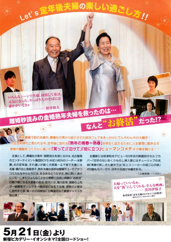 ということで、予想はしていましたがあまり心に響く映画でもありませんでしたし、「終活」の参考にもなりませんでした。前半の夫のような態度、考え方を持つ男性には、非常に参考になったかもしれませんが。 |