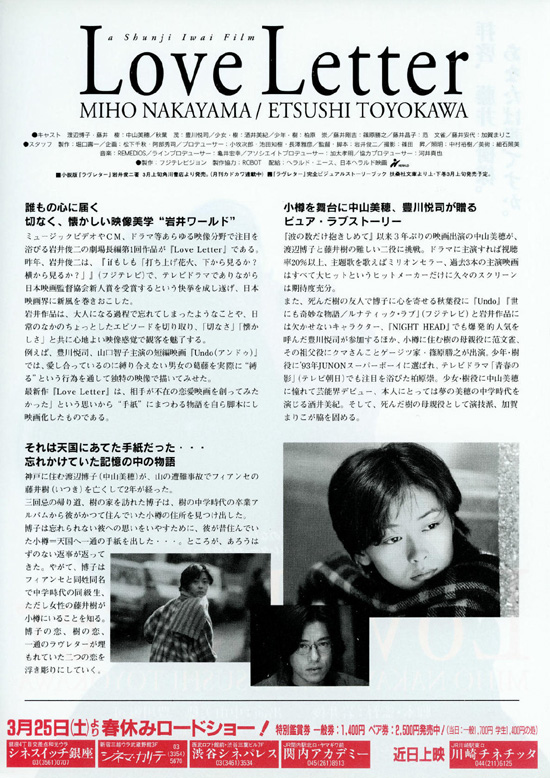 渡辺博子/藤井樹:中山美穂 / 秋葉茂:豊川悦司 / 藤井樹(少女時代):酒井美紀