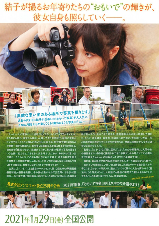 たったひとりの家族である祖母の死を機会に、結子は東京での夢破れて故郷に戻ってきます。幼馴染の一郎の勧めでお年寄りの遺影写真を撮ることになったのですが、お年寄りは遺影写真を撮るという縁起の悪いことには拒否反応を示します。遺影写真ではなく、思い出の写真を撮るということにしてお年寄りとかかわることによって、自分を見つめ直すという映画です。