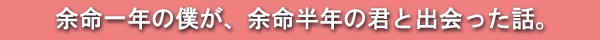 小説「余命一年と宣告された僕が余命半年の君と出会った話」を読んでから、この映画「余命一年の僕が、余命半年の君と出会った話。」を観ました。最後の春奈からのメッセージの方法とか、春奈が亡くなった時の秋人の行動など、細かなところで映画独自の展開となっています。タイトルもやや簡潔になっています。