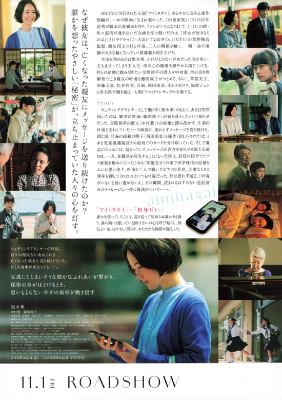 【あらすじ】 ウェディングプランナーの梓(黒木華)は中学生の時にいじめから助けてくれた親友・叶海(藤間爽子)の死を受け止められずに、生前二人でやり取りしていたスマホのトーク画面に、日々話しかけていました。梓は両親の離婚における責め合いを見てきており、付き合っている澄人(中村蒼)との結婚に踏み切れず悩んでおり、前に踏む出せずにいました。また、娘の死に向かい合う叶海の両親(西田尚美、田口トモロヲ)は、児童養護施設から娘へのカードを受け取ったのを機会に、娘の活動を知ります。娘の遺品であるスマホには、梓からのメッセージが届きます。それらの出来事が最後にすべて結びついていく・・・ |