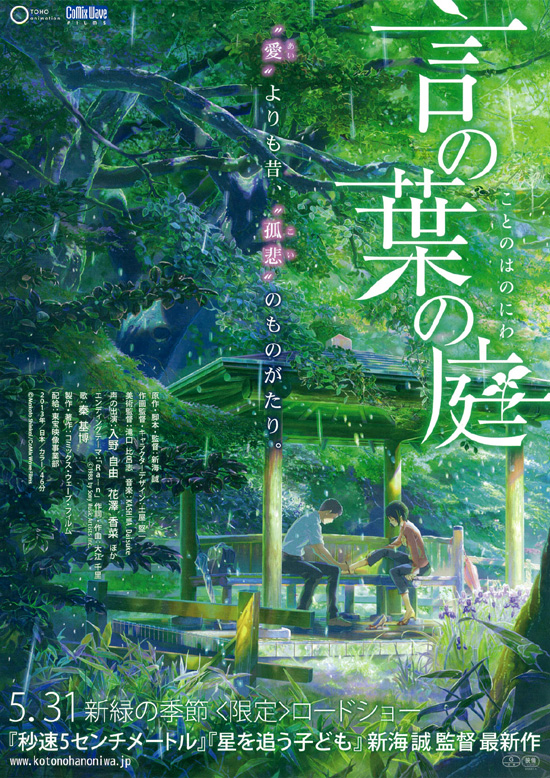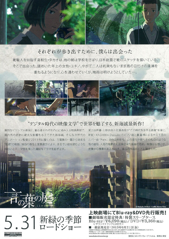 【あらすじ】 靴職人を目指す高校生のタカオは、雨の日は午前の授業には出ずに公園で靴のデザインを考えるのが日課だったが、そこである日、チョコレートをつまみにビールを飲む年上の女性ユキノと出会います。タカオはだんだんとユキノに惹かれていきますが、ユキノはあることで心を病んでいた女性で、タカオとは実は・・・ |