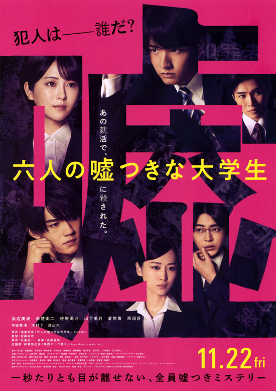小説の良さをうまく映像化されていてとても面白かったですが、小説に比べて省略されていることや若干の場面変更があり、犯人を明確にする表面的な話になってしまっているかなという感じでした。「6人の中から一人の内定者を決める」というところや、そこで明かされる個人攻撃の封筒の内容は小説とまったく同じですが、嶌(浜辺美波)の境遇が省略されていたり、8年後の嶌が真実を当時の4人(嶌と亡くなった波多野を除く)に明らかにする設定が変更されています。このあたりは、小説で感じたヒントや伏線の楽しさというものが無くなってしまっていると感じましたが、2時間の面白いストーリーにおさめるには仕方がないというか妥当なことかなと思いました。映像としてはこれはこれで楽しめますが、この作品に限って言えば、私は小説のほうが話の奥が深いし、登場人物の裏表や優しさが意外性を持って表現されていて面白いなという印象でした。
