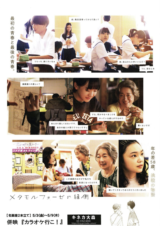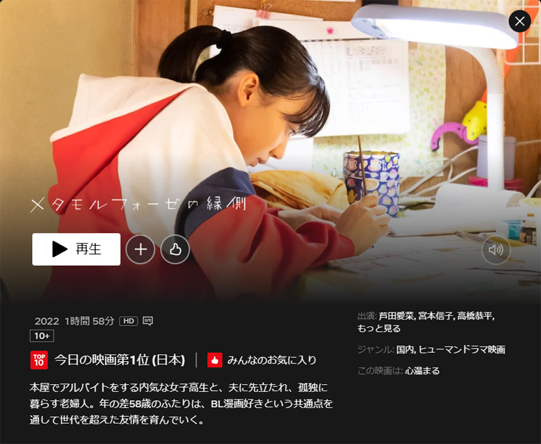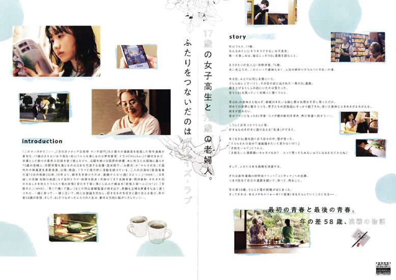 引っ込み思案で、趣味でBL漫画を読んでいる17歳の女子高生・うらら(芦田愛菜)と、書店で表紙の美しい絵に惹かれてBL漫画としらずに買った75歳の夫を亡くした雪(宮本信子)が、BLの世界に魅了されて世代を超えた友達になっていく・・・ |