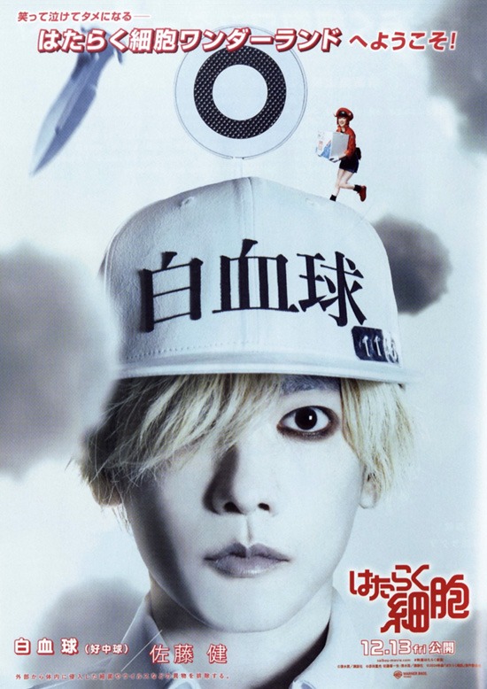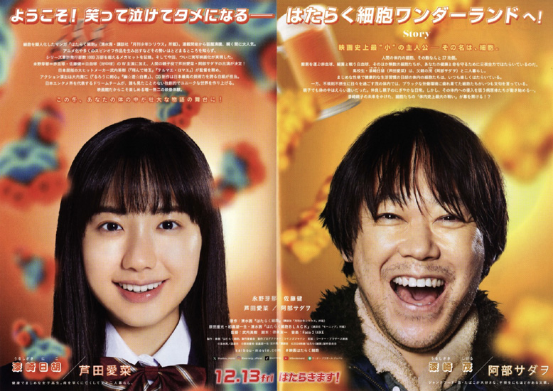 【あらすじ】 人の体内では37兆個もの細胞がそれぞれ役割を持ち、日夜その仕事をしています。真面目な女子高生・漆崎日胡(芦田愛菜)と、不摂生にもほどがある不健康な父親・漆崎茂(阿部サダヲ)の身体の中でも、その細胞たちが働いています。日胡の体の中では、赤血球(永野芽郁)や白血球(佐藤健)が日々精力的に働いています。一方、茂の身体の中は不摂生で過酷な環境になっており、細胞たちは愚痴をこぼしながら働いています。そんな時、日胡の身体に異常な白血球が誕生し、やがて体の中を支配し始め、正常な細胞と異常な細胞の戦いが始まる・・・ |