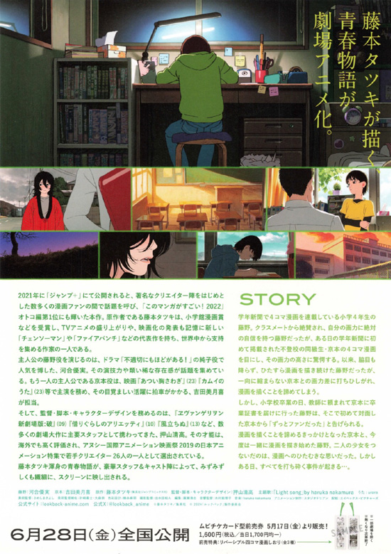 不登校で人とかかわるのが苦手な京本が、藤野と知り合うことによって勇気を出して自分の夢を実現していこうというところは、共感も感じますし頑張れというエールを送りたくなりますが、私はこの映画で感動したり、胸が熱くなるようなことはありませんでした。その理由を考えると、藤野のキャラクターが受け入れられない部分があるということかなと思います。自分のことしか考えていないのではと思う行動や言動が多いような気がします。京本のことを大切な友人と考えていれば、京本がもっと勉強したいと言ったときに、寂しいだろうけどあんな態度にはならないのではと思ったりしてしまいました。藤野は、きっと自分の気持をうまく表現できないという性格であり、心の中は言動や態度とは異なるのだろうとは思うのですが、そこまで心の裏を推察しなくてはいけないのかと思うと、素直に直接的に感動や優しさを感じることはできませんでした。