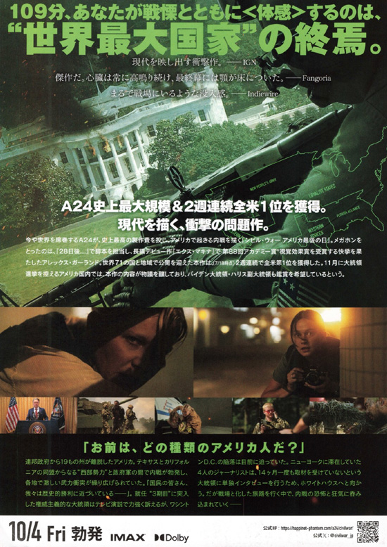 【あらすじ】 大統領が独裁化して内紛状態に陥ったアメリカ、主人公のリー、ジョエルなど4人のジャーナリストは、大統領に直接インタビューをすべく、ニューヨークからワシントンD.C.に向かいます。その道程ではいろんな光景を目にし恐怖の体験にさらされます。そしてやっとたどり着いたホワイトハウスでの攻防の中、やっとジョエルは大統領にコメントを求めるが、返ってきた内容は・・・ |