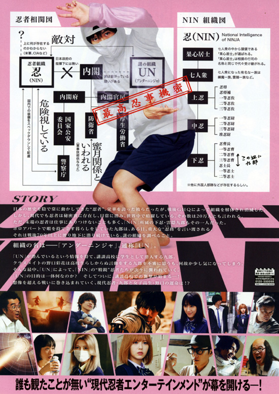 【あらすじ】 太平洋戦争後、忍者組織はGHQにより解体されたと思われていましたが、現在も警察や防衛省と関係を持ちながら忍者組織「NIN」として暗躍しています。しかし、その「NIN」から離れていったものたちを集めて「NIN」と敵対する忍者地下組織「アンダーニンジャ・UN」が不穏な動きを見せています。「NIN」の末端として暇を持て余していた忍者・雲隠九郎(山崎賢人)は、「UN」の調査という重要任務を与えられ、生徒として講談高校に潜り込み・・・ |