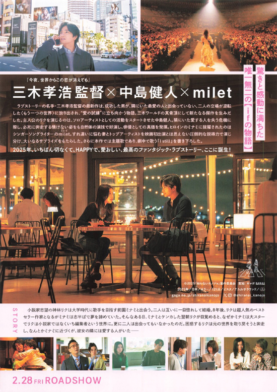 【あらすじ】 大学時代に出会ったリク(中島健人)とミナミ(milet)は、結婚して8年を迎える。リクは夢を実現しベストセラー作家となり、ミナミはリクを支えて歌手になる夢を諦めていた。ある日、リクとミナミは些細な言い争いとしてしまう。リクが翌朝目覚めると、ミナミの姿はなく、リクは文芸誌の編集部員、ミナミは天才シンガーソングライターとして活躍、というふたりが出会わなかった世界に投げ込まれた。リクは戸惑いながらも現実を受け止め、親友の恵介(桐谷健太)の協力を得てミナミに近づいて何が原因でこうなったのかを考えていく・・・ |
