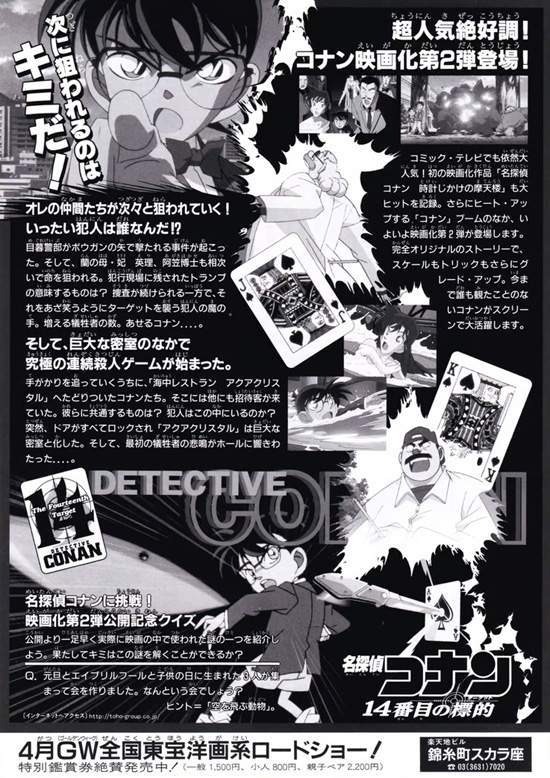 ある日、公園でジョギング中の目暮警部がボウガンで狙撃された。この事件を皮切りに、妃英理や阿笠博士が次々に狙われる。コナンはこれらの襲撃事件がトランプの札に倣って名前に「十三」から「一」までが入る人間が順に襲われていることと、そのその犯行が小五郎に関連した人物を狙っていることを突き止める。捜査線上には、かつて英理を人質にとって小五郎が銃で発砲した村上丈が浮上した。標的となり得る人物を守るためにソムリエの沢木公平を訪ねると、海洋娯楽施設「アクアクリスタル」に行くことになっており、そこには名前に数字を持つ4人が集まっていた・・・ |