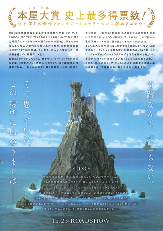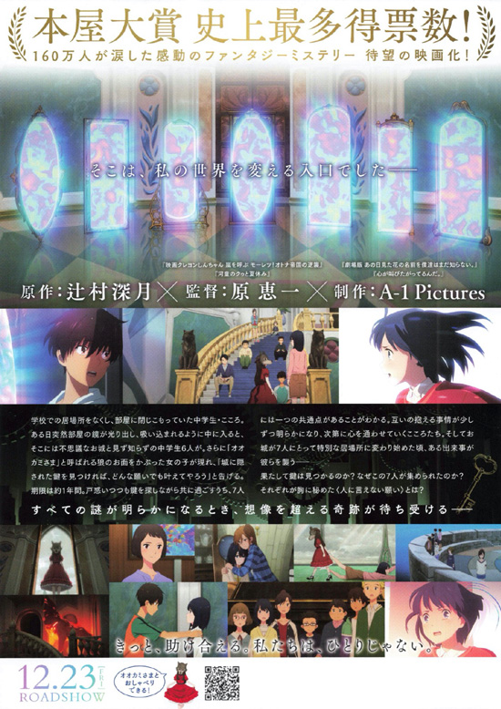 子供たちを「赤ずきん」と呼ぶオオカミさまは、この孤城の中に隠された「願いの鍵」を見つけられた1人だけが願いの部屋へ入ることができ、どんな願いでも叶えられると説明する。ただし、孤城にはルールがあり、日本時間の午前9時から午後5時までは鏡を通って現実世界から来て良いが、午後5時以降に孤城に1人でも残っていると、その日に城内にいた者は連帯責任で狼に喰われる。そして、誰かが願いを叶え、この城から出た時点で全員の記憶が消えるという。鍵を探す以外には特に何も起こらない城内でこころは、いじめなどしないマイペースな中学生たちと穏やかな友人関係を築いていくが・・・ |