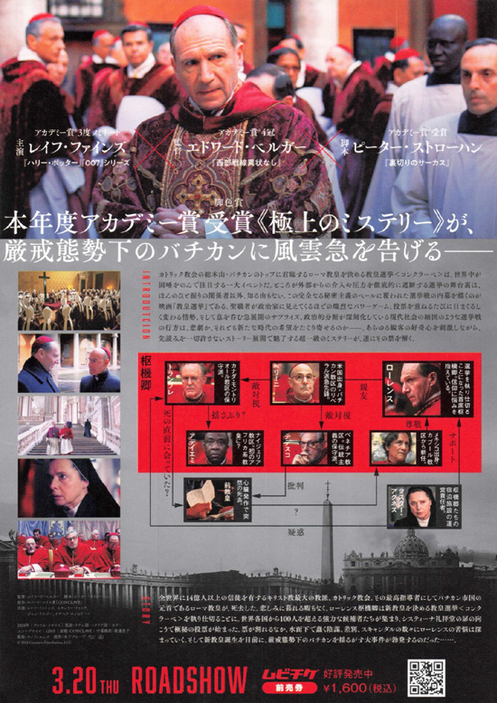 ある日、カトリック教会のトップにしてバチカン市国の国家元首であるローマ教皇が、心臓発作のため突如として急死してしまう。教皇死去の悲しみに暮れる暇もなく、イギリス出身でローマ教皇庁首席枢機卿を務めるトマス・ローレンス枢機卿は枢機卿団を招集し、次のローマ教皇を選出する教皇選挙(コンクラーヴェ)を執行することとなった。100人以上の枢機卿がコンクラーヴェが行われるシスティーナ礼拝堂に集まる中、有力候補者として、アメリカ出身でバチカン教区所属、リベラル派最先鋒のベリーニ枢機卿、カナダ・モントリオール教区所属、穏健保守派のトランブレ枢機卿、ナイジェリア教区所属、初のアフリカ系教皇の座を狙うアデイエミ枢機卿、イタリア・ベネチア教区所属、保守派にして伝統主義者のテデスコ枢機卿の4人の名が取り沙汰される中、メキシコ出身で昨年に前教皇によって新たに任命されたばかりのアフガニスタン・カブール教区のベニテス枢機卿が開始直前に到着する。かくしてコンクラーヴェが始まるが、枢機卿団の票が割れていく水面下では陰謀や差別、スキャンダルの数々が犇めいていた。裏で信仰に関する悩みを抱えるローレンスはそれらに苦悩を深めつつもコンクラーヴェを執行していくが、新教皇選出を目前とする中、厳戒態勢が敷かれたバチカンを揺るがす大事件が勃発する・・・ |