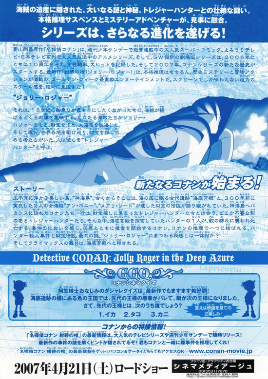 バカンスで神海島を訪れたコナン一行は、財宝探しに集まったトレジャーハンター一味と出会う。神海島は、海底の古代遺跡・海底宮殿が発見され有名になった島である。また、300年前に2人の女海賊アン・ボニーとメアリ・リードが遺したという財宝伝説も語り継がれている。興味を持ったコナン達は島の観光課が企画した宝探し、蘭と園子はダイビングとそれぞれバカンスを満喫する。そんな中、トレジャーハンターの1人が、海底宮殿を探索中にサメの群れに襲われ死亡した。当初は不幸な事故と思われたが、ダイビングスーツに残っていた痕跡から、コナンはこの事件が殺人だと推理する・・・ |