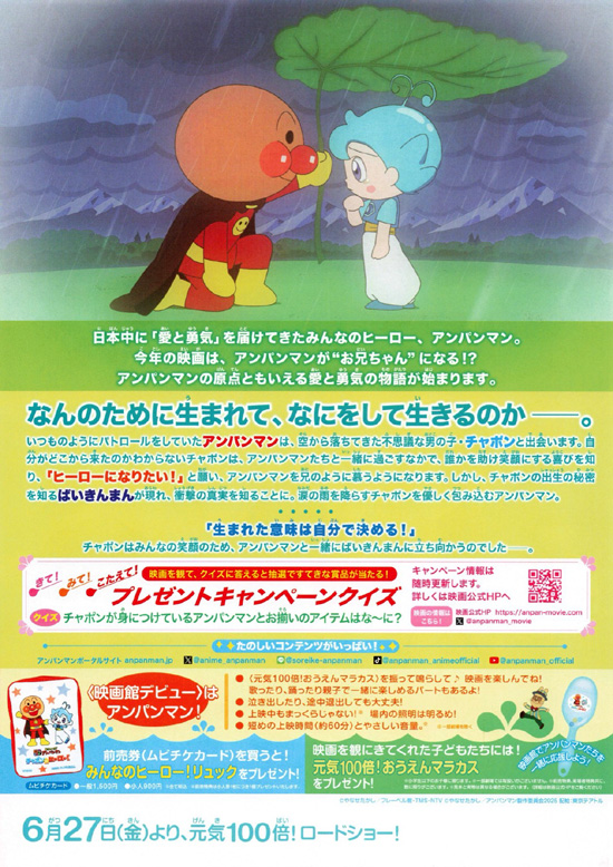 いつものようにパトロール中をしていたアンパンマン(戸田恵子)は、空から落ちてきた不思議な少年・チャポン(蒼井優)と出会う。自分がどこから来たのかわからないチャポンは、アンパンマンたちと一緒に過ごすなかで、誰かを助け笑顔にする喜びを知り、「ヒーローになりたい」と願い、アンパンマンを兄のように慕うようになる。しかし、チャポンの出生の秘密を知るばいきんまん(中尾隆聖)が現れ、衝撃の真実を知ることに・・・ |