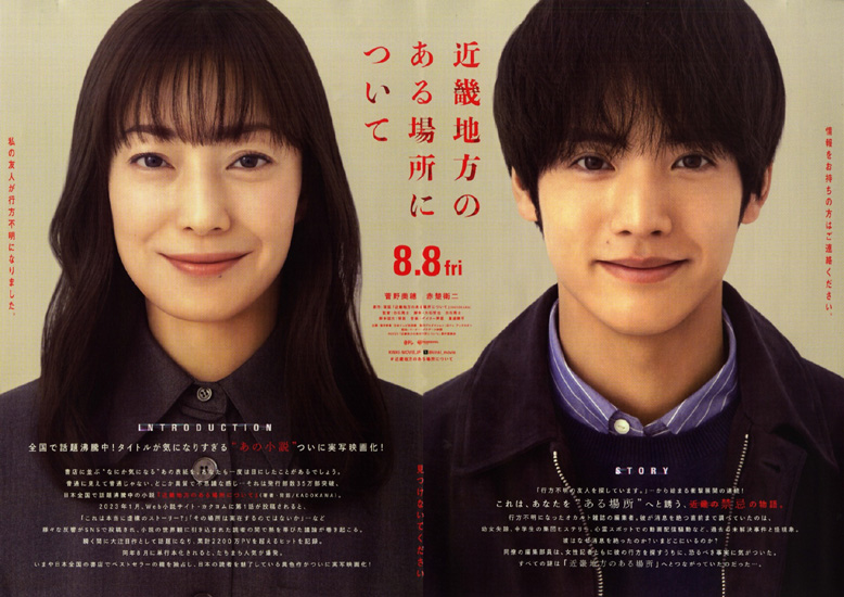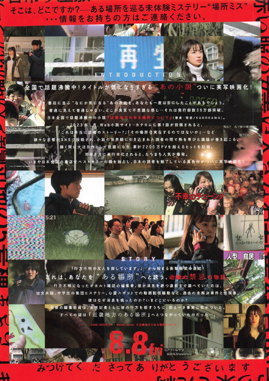 オカルト雑誌「超・不思議マガジン」編集部員・小沢(赤楚衛二)と女性記者・浦野(菅野美穂)は、失踪した編集長・佐山(夙川アトム)の行方を追っていた。ふたりは、彼が姿を消す直前まで、未解決事件や都市伝説、怪現象などを調べていたことを知る。記事としてまとめるために、それらの情報を繋ぎ合わせていくと、すべての謎は近畿地方のある場所へ繋がっていた・・・ |