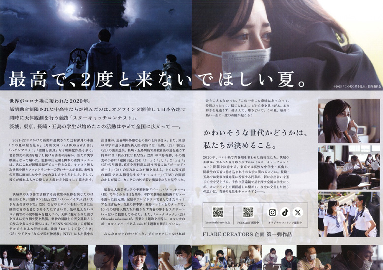 亜紗(桜田ひより)は茨城県の砂浦第三高校の二年生。顧問の綿引先生(岡部たかし)のもと、天文部で活動している。コロナ禍で部活動が次々と制限され、楽しみにしていた合宿も中止になる中、望遠鏡で星を捉えるスピードを競う「スターキャッチコンテスト」も今年は開催できないだろうと悩んでいた。真宙(黒川想矢)は東京のひばり森中学の一年生。新入生のうち唯一の男子でありコロナでサッカーをできないでいる。円華(中野有紗)は長崎・五島列島の旅館の娘。高校三年生で、吹奏楽部。旅館に他県からのお客が泊っていることで親友の小春(早瀬憩)から距離を置かれ、やりきれない思いを抱えている時に、柊(和田庵)に天文台に誘われる。コロナ禍で行動が制限される中で、亜紗たちがオンラインで開催した「スターキャッチコンテスト」でそんな生徒たちがつながっていく・・・ |
